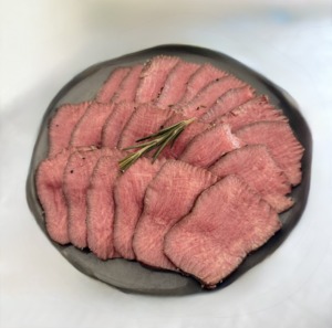 牛たんをミネラル豊富な天日塩と赤ワインベースで味付けし熟成、じっくり低温調理から、バーナーで焼き目を付けた、こだわりのたたき風熟成牛たん。